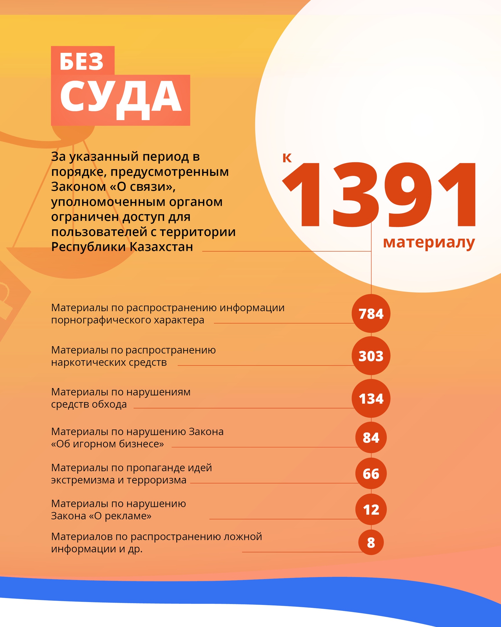 1404 — столько материалов было заблокировано в Казахстане за три месяца. Больше половины из них — порнографического характера. Остальные нарушения связаны с распространением наркотических средств и оружия, а также нарушениями авторского права, пропагандой идей экстремизма и терроризма, распространением ложной информации.