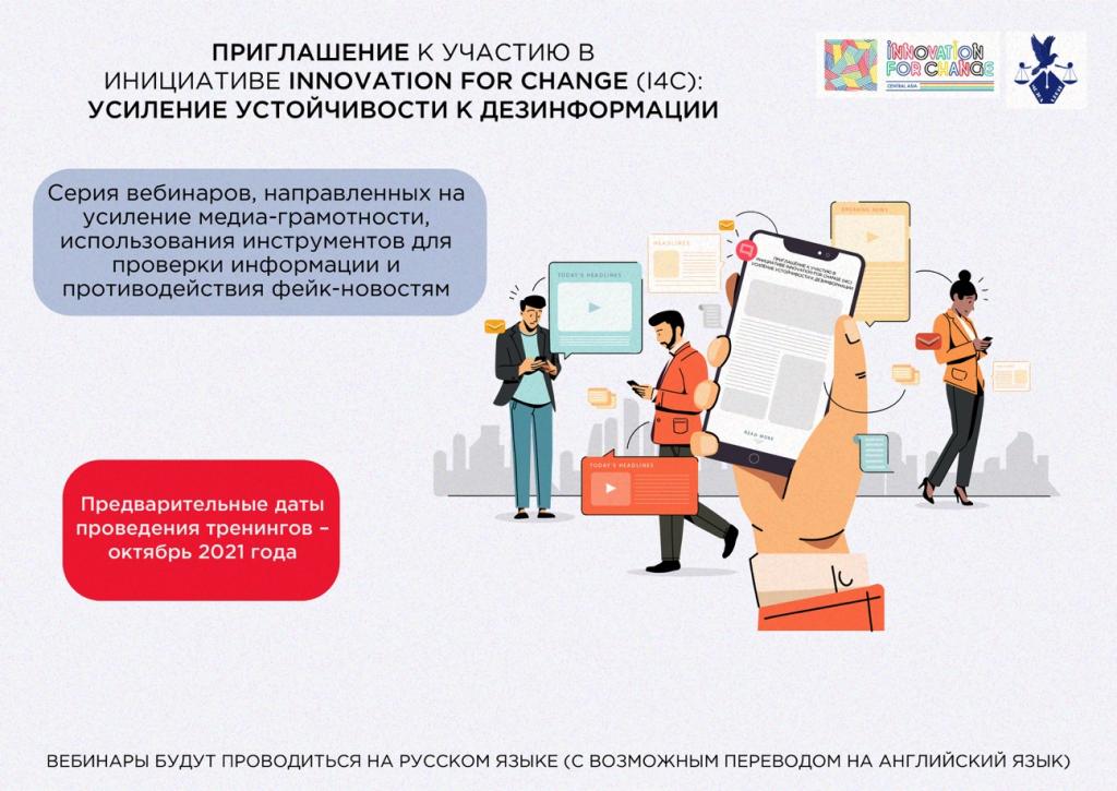 22/09/2021 ПРИГЛАШЕНИЕ К УЧАСТИЮ В ИНИЦИАТИВЕ INNOVATION FOR CHANGE (I4C): УСИЛЕНИЕ УСТОЙЧИВОСТИ К ДЕЗИНФОРМАЦИИ Подробнее Подробнее