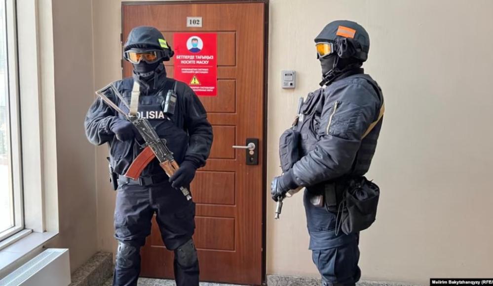 Сотрудники полицейского спецназа у двери редакции Orda.kz в Алматы. 1 декабря 2025 года