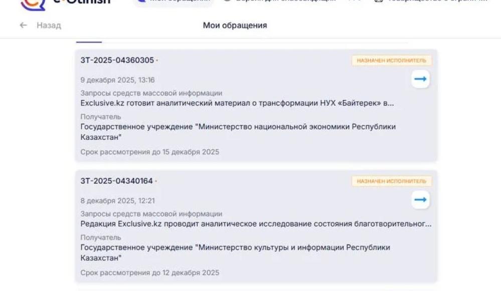 Аналогичная ситуация сложилась с запросом, направленным 9 декабря министерству национальной экономики. Он содержал вопросы для аналитического материала о трансформации холдинга «Байтерек». Срок ответа истёк 15 декабря, но на момент публикации новости обращение также осталось без исполнения.
