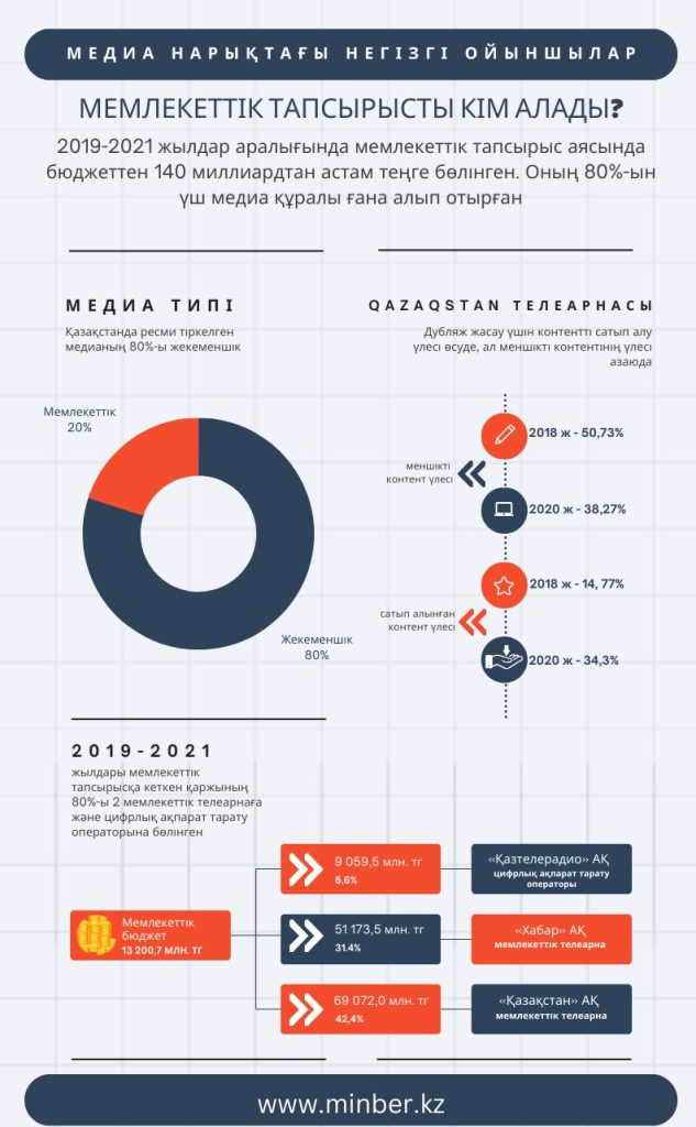2019-2021 жылдар аралығында мемлекеттің ақпараттық саясатын жүзеге асыру мақсатында 140 миллиард теңге аударылған екен. Осы соманың 80%-ын екі мемлекеттік арна мен бір ұлттық оператор алып келген. Мәселен, осы жылдар аралығында мемлекеттік тапсырысқа бөлінген 13 200,7 миллиард теңгенің 9 059,5  миллиардын “Қазтелерадио” (5,6%), 51 173,5  миллиард теңгесін (31.4%),  69 072,0 миллиардын  (42,4%) «Қазақстан» АҚ алған.