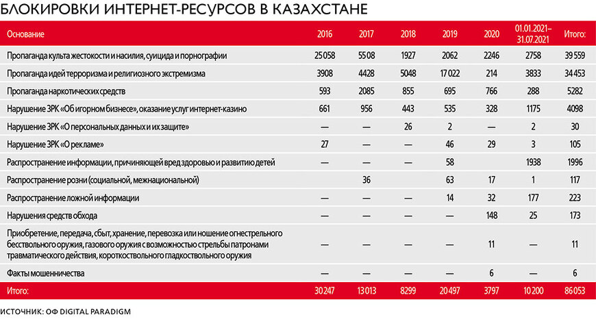 «Порядок приостановления доступа к интернет-ресурсам относится к пометке «Для служебного пользования». То есть фактически мы не можем прозрачно видеть механизм работы уполномоченных органов в процессе блокировок сайтов. Мы можем только предполагать, а это неправильно. Проблема и в том, что ресурсы ограничивают без ведома администратора или владельца. Те сайты, которые обращались к нам за консультацией, жаловались, что перед блокировкой никакого уведомления о необходимости удаления противозаконного контента от госорганов не получали. Просто вдруг узнавали, что трафик из Казахстана упал, затем обнаруживали, что их заблокировали, и уже тогда начинали выяснять причину. Вы представляете, какой это удар по сайту, особенно если он коммерческий, – сколько упущенной выгоды и аудитории? В общем, отсутствует транспарентность», – констатирует собеседник.