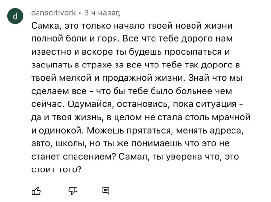 Отвечая на вопрос о форме угроз и о том, насколько они опасны для жизни, собеседница выделила один момент: речь идет не только об угрозах, кибербуллинге, но и о нанесении материального ущерба.