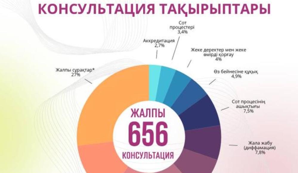 Ең өзекті тақырыптар: – Ақпаратқа қол жеткізу — 13% – Интернеттегі қауіпсіздік — 12% – Сотқа дейінгі талаптар — 9% – Авторлық құқық, жала жабу, сот процесінің жариялылығы — 7–8% Сондай-ақ біз келесі мәселелер бойынша да көмек көрсеттік: бейнені пайдалану құқығы, жеке деректерді қорғау, БАҚ тіркеу, аккредитация, журналистің жұмысына кедергі келтіру, медиа кеңістіктегі балалар құқығы.